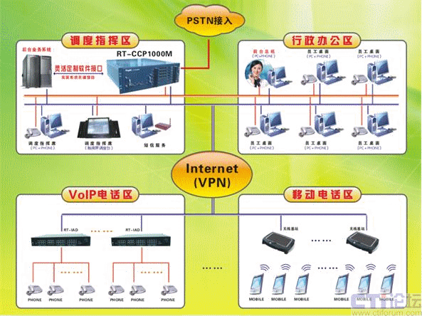 在傳統(tǒng)調(diào)度技術(shù)基礎(chǔ)上充分地融合了IP網(wǎng)和無線網(wǎng)絡(luò)(Wifi / Wimax / CDMA2000),同時具備傳統(tǒng)調(diào)度、IP調(diào)度和無線調(diào)度的各種功能,可完美地將調(diào)度指揮功能從本地延伸到遠端現(xiàn)場的每一個角落,支持遠程接入/遠程調(diào)度模式;可實現(xiàn)調(diào)度指揮系統(tǒng)+行政辦公系統(tǒng)一體化的整體方案,可一站式向用戶或者集成商交付使用,同時還能提供二次開發(fā)接口,實現(xiàn)調(diào)度指揮系統(tǒng)與用戶方后臺信息管理系統(tǒng)的緊密結(jié)合;產(chǎn)品安裝部署也是非常方便,組網(wǎng)靈活,大致如下: