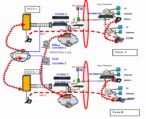 在1個(gè)核心城市放置SS3000-T軟交換平臺(tái),在其他的3個(gè)城市通過IP專網(wǎng)進(jìn)行終端網(wǎng)關(guān)設(shè)備的接入。核心SS3000-T設(shè)備使用雙機(jī)冗余備份的方式進(jìn)行保護(hù)。通過中繼網(wǎng)關(guān)MG3000-T4和PSTN電話網(wǎng)絡(luò)進(jìn)行連接。全部的電話使用正式的電話號(hào)碼,和座機(jī)、手機(jī)完全互通。