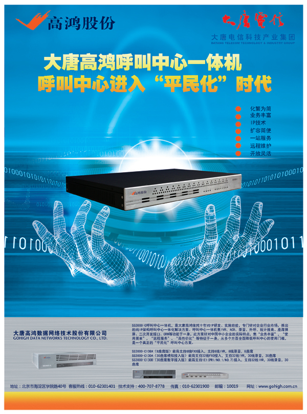 IP語(yǔ)音通信領(lǐng)域的專家,CTI市場(chǎng)的新銳,大唐高鴻公司在IP呼叫中心市場(chǎng)繼續(xù)大力投入,新推出的一體化IP呼叫中心產(chǎn)品集強(qiáng)大功能與便捷性于一身,為企業(yè)自建呼叫中心首選.