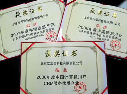 2007年1月16日,中國計算機用戶協(xié)會在京召開隆重而盛大的年度頒獎儀式。MyCRM在本次會上榮獲殊榮,一舉囊括了“2006年度中國信息產業(yè)CRM 軟件市場占有率最高產品”,“ 2006年度中國計算機用戶CRM服務優(yōu)質企業(yè)”和“2007 年度中國信息產業(yè)行業(yè)采購CRM軟件產品首選品牌”。本次獲獎充分體現(xiàn)了MyCRM在CRM市場的全面領先優(yōu)勢。