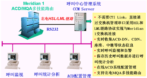 華呼CCM系統(tǒng)不需要Meridian Link,直接通過交換機(jī)管理串口采用HSL(High-Speed Link)和LML(Load Management Link)鏈路協(xié)議實(shí)現(xiàn)與Meridian 1交換機(jī)連接;實(shí)時(shí)收集ACD座席、隊(duì)列、中繼等狀態(tài)信息,提供實(shí)時(shí)監(jiān)控和告警;保存各類歷史呼叫數(shù)據(jù),提供多種統(tǒng)計(jì)分析手段;提供ACD有關(guān)參數(shù)的實(shí)時(shí)和預(yù)定配置管理功能;支持北電MQA(Multiple Queue Assignment)技能路由功能,使座席可同時(shí)登錄到5個(gè)ACD隊(duì)列,在交換機(jī)內(nèi)部實(shí)現(xiàn)技能路由;對各類數(shù)據(jù)分析以表格、直方圖、餅圖等方式進(jìn)行直觀顯示并可進(jìn)行打印,以及提供多樣的告警提示。