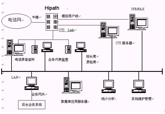 主要包括:Siemens Hipath 3000系列交換機(jī)、CTI服務(wù)器、IVR/FAX服務(wù)器、業(yè)務(wù)代表座席、班長(zhǎng)和質(zhì)檢座席、電話錄音監(jiān)聽系統(tǒng)、數(shù)據(jù)庫(kù)應(yīng)用服務(wù)器、業(yè)務(wù)網(wǎng)關(guān)、統(tǒng)計(jì)分析工作站、系統(tǒng)維護(hù)管理工作站、網(wǎng)絡(luò)系統(tǒng),其邏輯結(jié)構(gòu)下圖所示。
