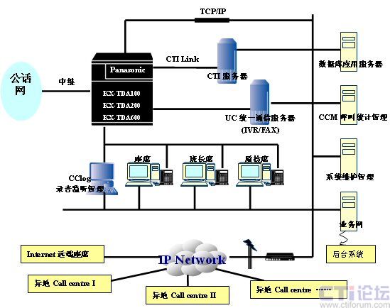 采用Panasonic TDA系列交換機,本身提供自動呼叫排隊ICD功能,通過LAN網(wǎng)絡(luò)接口與計算機建立CTI通信連接,支持CSTA Ⅲ標準。 系統(tǒng)可提供ISDN數(shù)字中繼和模擬中繼,實現(xiàn)與電信公網(wǎng)連接,通過數(shù)字分機板與數(shù)字話機建立連接,通過模擬分機板與模擬話機和模擬語音傳真卡建立連接,通過混合分機板與數(shù)字話機和模擬話機建立連接。