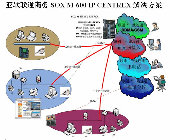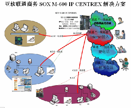 亞軟SOX融合通信解決方案也叫聯(lián)通商務解決方案,該方案是基于軟交換的可為多個集團用戶提供IP語音解決方案。SOX融合通信解決方案為集群用戶提供了區(qū)別于傳統(tǒng)集團內(nèi)部、外部的通信方式,集團無需再購置PBX及為其支付維護費用。由于SOX融合通信解決方案是置于IDC托管中心并基于IP軟交換技術,所以沒有地域限制,具有集群性、可移動性等IP通信特征。