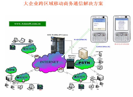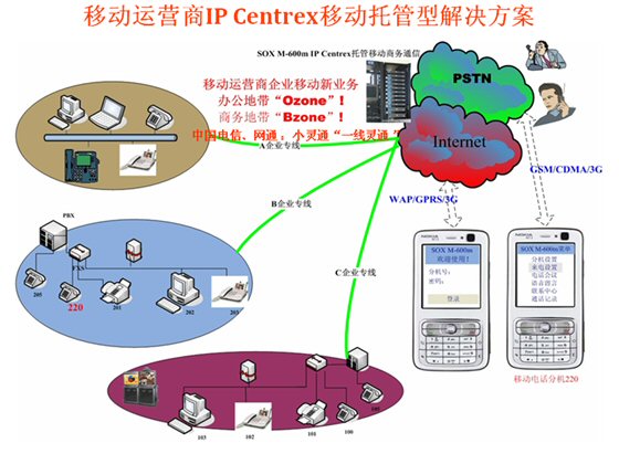 Mail,可發(fā)起WAP電話會議,可訪問企業(yè)的CRM、ERP等應用軟件并集成點擊呼叫等等)。不僅移動運營商可以替代第一代的移動總機,固網(wǎng)運營商采用SOX-M移動軟交換也可以輕松的開展移動總機(小靈通或手機)的業(yè)務了,但SOX-M系統(tǒng)融合移動運營商的無線互聯(lián)網(wǎng)數(shù)據(jù)業(yè)務將產(chǎn)生更大的利于企業(yè)應用的前景,移動總機(語音+WAP)的融合應用成為第二代移動總機殺手級應用,令移動總機如虎添翼。