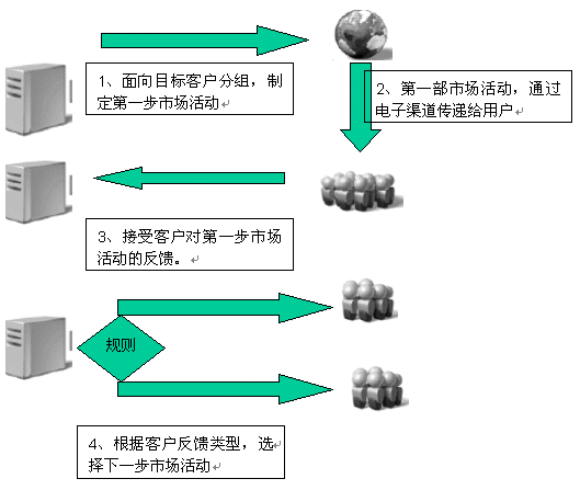 電子化營銷過程,是通常是多步驟市場活動。每個步驟完成一定的工作,下一步的市場活動將根據(jù)客戶對市場活動的反饋和內(nèi)置的市場活動的規(guī)則進(jìn)行選擇。而且每個步驟客戶市場活動的反饋,都由電子化營銷系統(tǒng)中的反饋處理系統(tǒng)集中到CRM系統(tǒng)中。從而為市場活動效果評估,提供數(shù)據(jù)上的支持。