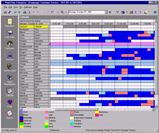 絕大多數(shù)的WFMS可以通過歷史數(shù)據(jù)和人員情況自動(dòng)生成排班表。而且它也只是簡(jiǎn)單的根據(jù)呼叫中心的運(yùn)營(yíng)時(shí)間來排班。舉個(gè)例子,某個(gè)呼叫中心在排班是有兩個(gè)班,一個(gè)工作時(shí)間是早7點(diǎn)到下午3點(diǎn),另一個(gè)是早九點(diǎn)到晚五點(diǎn),這就意味著不僅要安排早、晚休息,還要顧及到午休的時(shí)間。休息的安排要保證能夠在電話的持續(xù)中也能有持續(xù)的人員保證電話量。在這個(gè)自動(dòng)化軟件的之中還有一個(gè)因素要能夠?qū)崿F(xiàn)自動(dòng)化--人的因素。例如:Mary和Jane想同時(shí)去吃午餐,然而自動(dòng)化的排班表并不是這樣的。然而主管根據(jù)當(dāng)時(shí)的話務(wù)量情況和工作狀況以及工作規(guī)范批準(zhǔn)了Mary和Jane共享午餐的要求,而WFMS就要能夠處理這樣很有可能發(fā)生,而且是合理的情況。排班表的更改應(yīng)該就是簡(jiǎn)單的拖拽圖標(biāo)就應(yīng)該能夠?qū)崿F(xiàn)的功能,并且能夠在這種更改會(huì)對(duì)預(yù)測(cè)的話務(wù)量差生不好影響時(shí),拒絕這種拖拽行為。