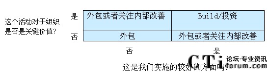 如果這個活動是關(guān)鍵任務(wù),而且有時候你有穩(wěn)固的內(nèi)部資源和已經(jīng)證明的能力,那么你很可能想保持自建活動,并內(nèi)部投資其增長。但是,如果這個活動不是那么重要,或者你現(xiàn)在在做的事并沒有做好,那么外包的意義就更大。