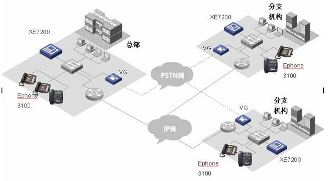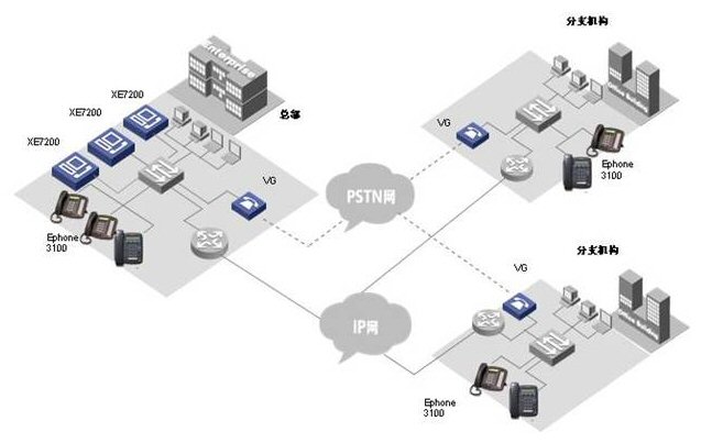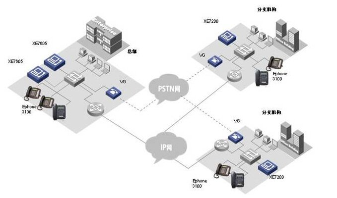 各小分支機構的IP語音終端可以直接注冊到本地XE 7000上, 從而實現(xiàn)整網(wǎng)的分布式部署。
