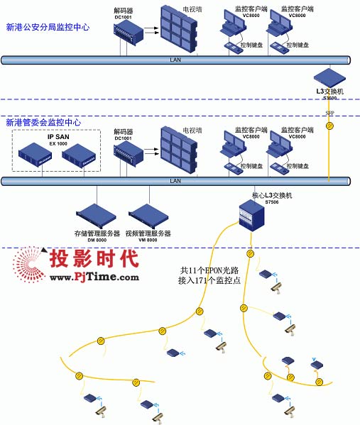 除了攝像頭與圖像顯示設(shè)備之外,整個監(jiān)控系統(tǒng)主要采用的都是H3C設(shè)備。系統(tǒng)用11(應(yīng)改成10條,最終只用了10條)條EPON光路接入全部171個監(jiān)控攝像頭;并采用專業(yè)的EX1000存儲產(chǎn)品為120T關(guān)鍵歷史視頻數(shù)據(jù)的提供了高可靠性的存儲保護;而S7506、S3600交換機優(yōu)化的組播特性和特色的雙流技術(shù)則確保了所有監(jiān)控點的高清晰、高實時性、支持大量并發(fā)訪問。系統(tǒng)的集中管理、批量配置、全網(wǎng)網(wǎng)管也可以為新港開發(fā)區(qū)節(jié)省管理成本。