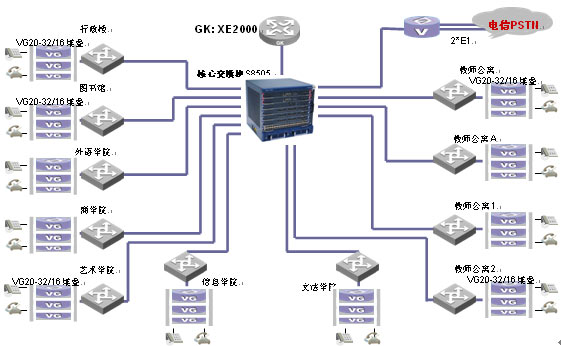 IP語音網(wǎng)采用華為3Com全系列語音視訊產(chǎn)品。為了滿足學(xué)校通訊的需求,華為3Com選用Quidway XE2000 IP PBX語音服務(wù)器作為核心呼叫控制設(shè)備,作為獨(dú)立控制的語音服務(wù)器,網(wǎng)絡(luò)規(guī)劃完®全自主,實(shí)現(xiàn)快速部署。采用50余臺ViewPoint®
