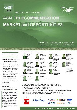 2006亞洲信息及通信技術(shù)展覽會(huì),即亞洲CeBIT展將于今年9月17日至20日在上海新國際博覽中心召開。由中國國際貿(mào)促會(huì)電子信息行業(yè)分會(huì)與德國漢諾威展覽公司聯(lián)合主辦的這一展會(huì),近300家國內(nèi)外廠商參展,將分為數(shù)字設(shè)備及系統(tǒng)、商務(wù)應(yīng)用、通信三大展區(qū),多方位展現(xiàn)ICT行業(yè)的最新趨勢,并成為業(yè)內(nèi)廠商的專業(yè)貿(mào)易平臺(tái)。本次CeBIT展會(huì)期間(9月18、19日兩天),將在浦東證大麗笙酒店召開“2006亞洲通信及信息市場管理層論壇”。包括中國國家信息產(chǎn)業(yè)部、中國電信、韓國SK電訊、BDA中國等多家政府機(jī)關(guān)、運(yùn)營商、制造商將參加本次論壇,并做重要發(fā)言。