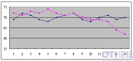 這是兩個呼叫中心從早上8點開始,一直到晚上6點,每隔半個小時的服務(wù)水平?梢院芮宄目吹,藍色這條線,它服務(wù)水平在91到48這中間震蕩,平均服務(wù)水平是73左右,粉紅色這條線,雖然平均服務(wù)水平也是在73左右,但震蕩幅度卻小了很多,服務(wù)水平只在81到68這中間震蕩。
