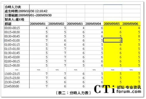 分時(shí)人力表在管理上有重要的地位,用于檢視時(shí)間內(nèi)排定的出席人數(shù),通常是將此數(shù)據(jù)與預(yù)測的話務(wù)需求做比對(duì),檢查排定人力數(shù)與話務(wù)曲線的擬合度。在現(xiàn)場管理時(shí),則用于小休調(diào)度,避免小休人數(shù)過多,使出席人數(shù)降到關(guān)鍵少數(shù)的臨界點(diǎn)下,造成服務(wù)水平大幅跌落的狀況發(fā)生。