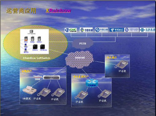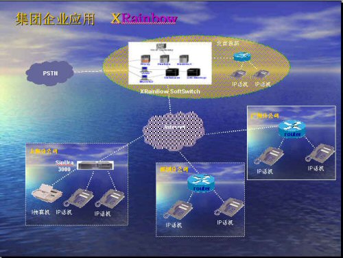。。首先我們需要這4個地點都有自己的網(wǎng)絡接入,最好是寬帶。以北京總部為列,如果將Xrainbow系統(tǒng)放在北京總部,這就需要北京總部這邊有一個固定IP地址的網(wǎng)絡接入,其他分公司不需要固定ip地址,只要可以上網(wǎng)就可以登錄到北京總部的Xrainbow系統(tǒng)。這樣企業(yè)與分支機構之間就實現(xiàn)了零話費,同時還可以提供傳真業(yè)務。另外終端設備可以隨意移動,只要可以上網(wǎng)的地方就可以接入我們的終端設備,免去了因公司的發(fā)展或者搬動而要去申請初裝大量電話的煩惱。