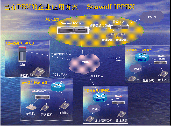 北京海狼網(wǎng)絡(luò)通信有限公司推出的Seawolf IPPBX解決方案切實從集團企業(yè)的利益出發(fā),為客戶成功地降低了通訊成本。Seawolf IPPBX是一款功能強大的小型語音交換平臺設(shè)備。它將傳統(tǒng)的交換機技術(shù)與VOIP的先進技術(shù)完美融合,提出了VOIP的企業(yè)級解決方案。此方案能大大縮減各大、中、小型企事業(yè)單位的通信費用,同時增加員工的工作效率。隨著產(chǎn)品的不斷普及,Seawolf IPPBX將成為企業(yè)辦公不可缺少的一部分。此方案適合于已經(jīng)有PBX的公司,由于先期已經(jīng)投入了PBX設(shè)備,費用昂貴,所以不會輕易被替換。在外地有多家分公司,使用傳統(tǒng)電話通訊費用很高,希望能降低成本。并希望在分公司所在城市可以通過當?shù)氐腜STN落地,節(jié)省長途費用。依照客戶的需求,我們制定了以下方案:海狼科技公司供稿 CTI論壇編輯