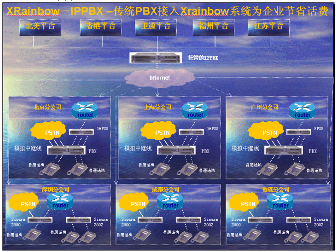 2. 北京、上海和廣州分公司可以通過傳統(tǒng)交換機(jī)PBX撥打PSTN電話,還可以通過架設(shè)