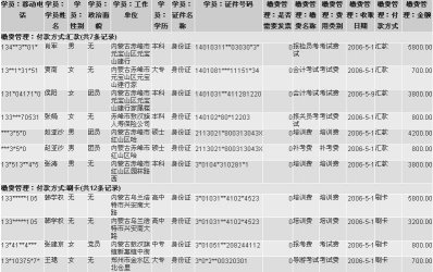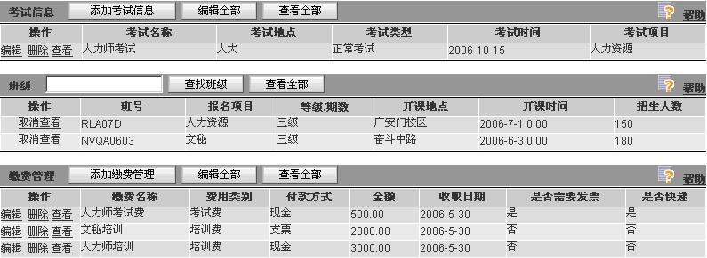 點(diǎn)擊單個(gè)學(xué)員查看頁(yè)面的相關(guān)列表,直接添加其他考務(wù)信息。張小玲是報(bào)名人力資源三級(jí)和文秘三級(jí)的學(xué)員,人力三級(jí)學(xué)習(xí)需要代辦考試。繳納人力培訓(xùn)費(fèi)3000元,文秘培訓(xùn)2000元,報(bào)名人力資源管理師考試費(fèi)500元。