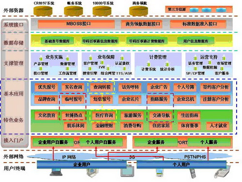 基本應(yīng)用包括中國(guó)電信集團(tuán)公司要求的12類業(yè)務(wù)及2類附加業(yè)務(wù),分別為優(yōu)先報(bào)號(hào)、實(shí)名查詢、品牌查詢、臨時(shí)報(bào)號(hào)、查詢轉(zhuǎn)接、短信報(bào)號(hào)、話務(wù)呼轉(zhuǎn)、企業(yè)名片、企業(yè)廣告、指路服務(wù)、個(gè)人號(hào)簿、企業(yè)總機(jī)、簽約客戶分析、注冊(cè)客戶分析。