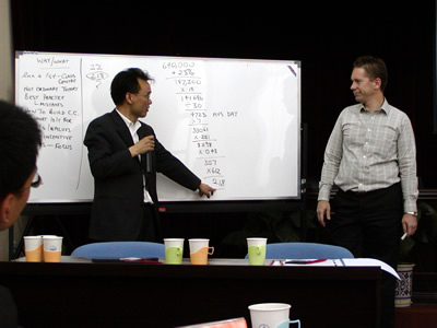 公開課在Simon Kriss先生詼諧的講課風(fēng)格的引導(dǎo)下自始至終在輕松、愉快又不失專業(yè)深度的氛圍中進行著,而Simon Kriss先生以呼叫中心運營管理的高效率為主題,從呼叫中心的環(huán)境布局、預(yù)測管理、人力資源管理、效率管理到專業(yè)報告形式等知識點上做了專業(yè)深入的講解。尤其在人力資源管理和效率管理方法的傳授時引發(fā)了全體學(xué)員極大的興趣和反應(yīng),例如:就人員附著度的定義及操作問題學(xué)員同講師展開了多倫次的討論。而Simon
