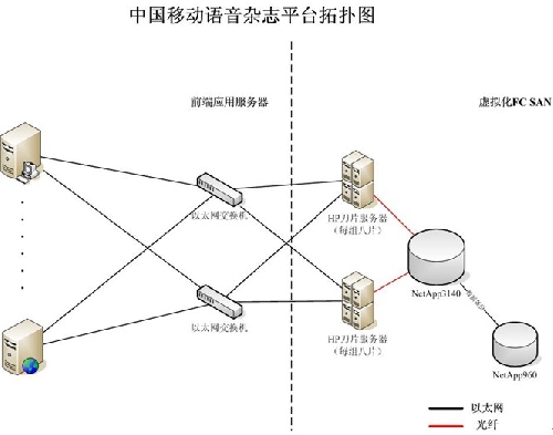 其中,NetApp FAS3140 配有 6 個 450GB 的 FC 磁盤和兩個 300GB FC 磁盤,裸容量為 46TB,用于運(yùn)行中國移動的語音雜志業(yè)務(wù),采用 Socket 連接。NetApp FAS2050 則內(nèi)置有 12 塊1TB SATA 磁盤,裸容量為 12TB,主要用于測試高陽公司 Oracle 數(shù)據(jù)庫和網(wǎng)站應(yīng)用等。