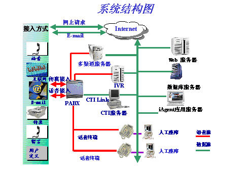 滿足呼叫中心多渠道接入的需求,使Internet呼叫中心成為現(xiàn)實(shí)。將網(wǎng)上ip電話請(qǐng)求納入傳統(tǒng)語音呼叫統(tǒng)一管理,無縫集成Email,傳真功能,實(shí)現(xiàn)網(wǎng)頁的互推瀏覽,文字交談,ip電話,網(wǎng)上資料發(fā)送等功能。