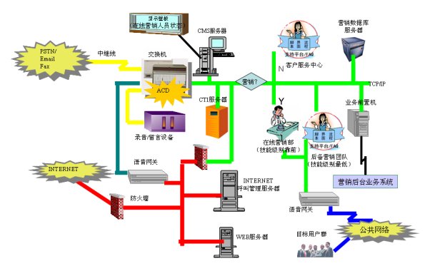 來(lái)自于公網(wǎng)的電話經(jīng)過(guò)交換機(jī)處理,經(jīng)過(guò)坐席人員判斷是否是銷(xiāo)售線索?然后轉(zhuǎn)接到相關(guān)的銷(xiāo)售代表處進(jìn)行接聽(tīng),在線營(yíng)銷(xiāo),同時(shí)營(yíng)銷(xiāo)人員在空閑時(shí)間通過(guò)客戶數(shù)據(jù)庫(kù)進(jìn)行外呼,挖掘商機(jī)進(jìn)行銷(xiāo)售。