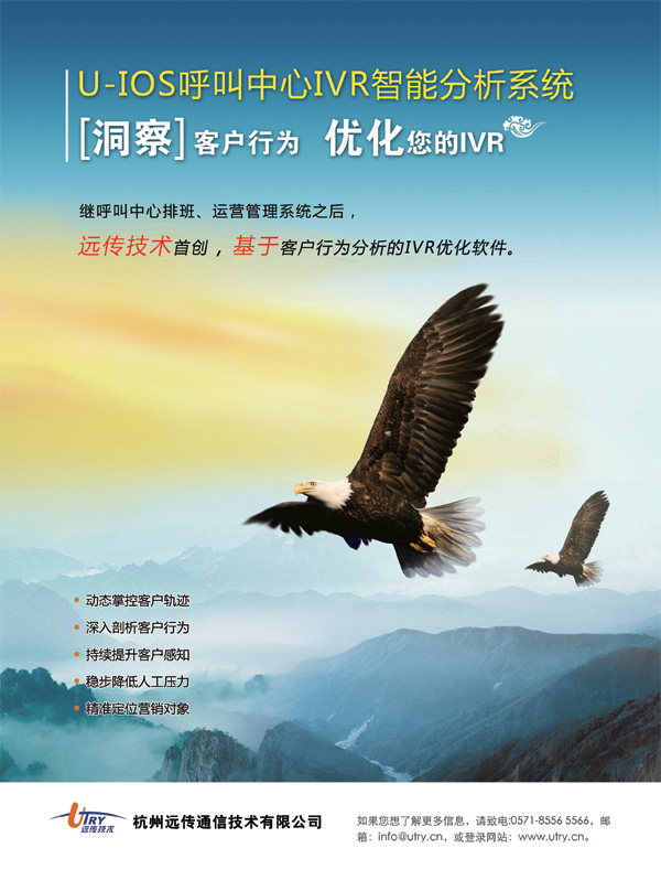 杭州遠(yuǎn)傳通信技術(shù)有限公司是國(guó)家高新技術(shù)企業(yè)、雙軟企業(yè),具備軟件成熟度CMMI 3級(jí)資質(zhì),是專業(yè)的客戶服務(wù)管理軟件及咨詢服務(wù)提供商。公司以“追求卓越”和“客戶滿意”為目標(biāo),致力于呼叫中心、營(yíng)業(yè)廳等客戶服務(wù)渠道的管理提升和信息化。憑借著公司細(xì)致周到的服務(wù),扎實(shí)穩(wěn)健的技術(shù)實(shí)力,公司在電信、金融、保險(xiǎn)、旅游、航空、電力、互聯(lián)網(wǎng)及電子商務(wù)等行業(yè)領(lǐng)域擁有著眾多的成功案例,獲得了客戶的廣泛贊譽(yù)。