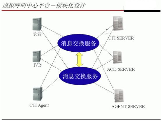 而呼叫中心平臺,則由網絡模塊方式組成:CTI服務器、ACD服務器、AGENT服務器、IVR服務器、錄音服務器等,這些呼叫中心平臺模塊,采用消息交換服務器的心型連接,組成統(tǒng)一的系統(tǒng),從而充分保證系統(tǒng)的靈活性、擴充性。