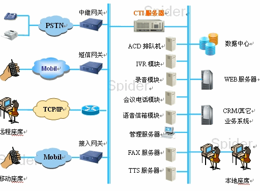 隨著呼叫中心相關(guān)技術(shù)的發(fā)展,呼叫中心的功能日益豐富,其組成結(jié)構(gòu)也日益復(fù)雜。一個完整的呼叫中心可以認為由基本部分和擴展部分兩部分組成。呼叫中心的基本組成部分為:自動呼叫分配模塊(ACD)、IVR交互式語音應(yīng)答系統(tǒng)、CTI服務(wù)器、錄音、人工座席、班長席、后臺管理系統(tǒng)等;擴展模塊包括FAX服務(wù)器、web服務(wù)器、email服務(wù)器及語音信箱、會議電話等功能。