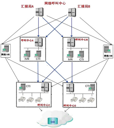 用勤科技的電信級呼叫中心解決方案,采用前置交換機(jī)和網(wǎng)絡(luò)IVR實現(xiàn)客戶語音接入排隊,由幾臺交換機(jī)組成一個網(wǎng)絡(luò)ACD,呼叫中心A,呼叫中心B和網(wǎng)絡(luò)IVR實現(xiàn)自動語音服務(wù),呼叫中心C和呼叫中心D實現(xiàn)人工服務(wù)。呼叫中心C和呼叫中心D實現(xiàn)負(fù)載均衡,互為備份,如果其中一個呼叫中心癱瘓,另外一個呼叫中心自動接管完全的呼叫。