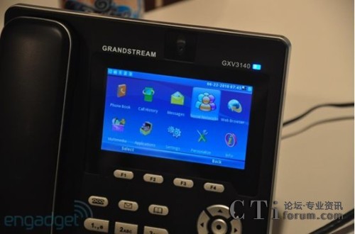 潮流網(wǎng)絡(luò)(Grandstream)的多媒體視頻電話GXV3140和GXV3175很早就通過Skype認證并取得“plugged into Skype”的標簽許可,在話機中內(nèi)置了SkypeKit,可以進行文字聊天、影音通話等Skype應(yīng)用操作。以下是Skype發(fā)布SDK時演示的在Grandstream GXV3140上的影音通話的照片: