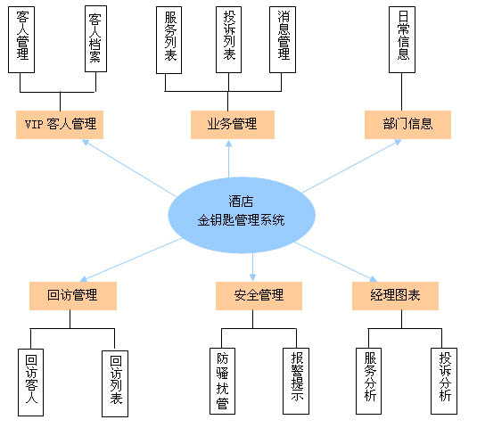 酒店金鑰匙管理系統(tǒng)通過客房電話與客人管理信息系統(tǒng)的結(jié)合,實現(xiàn)了酒店對在住客人服務(wù)事務(wù)的管理,最大限度地提高了酒店的服務(wù)效率、滿足客人的服務(wù)需求。系統(tǒng)包括VIP客人管理、業(yè)務(wù)管理、部門管理、回訪管理、安全管理、經(jīng)理圖表六大功能模塊,體系結(jié)構(gòu)如下: