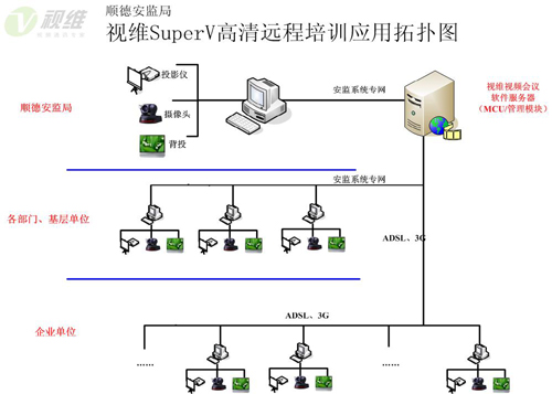 順德安監(jiān)局各部門及下屬單位使用安監(jiān)系統(tǒng)專網(wǎng)進行連接,而重點培育企業(yè)網(wǎng)絡(luò)情況復雜,涉及ADSL以及3G無線網(wǎng)絡(luò)等多種情況,視維根據(jù)順德安監(jiān)局、局下屬單位及重點培育企業(yè)的分布情況,將服務(wù)器架設(shè)在順德安監(jiān)局總部,并在總部搭建會議室和培訓中心,其他各部門、下屬單位和重點培育企業(yè)為分會場。