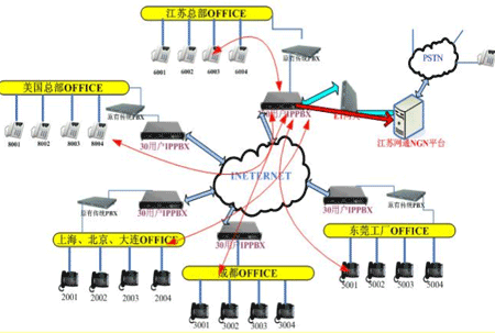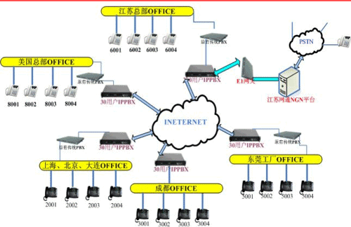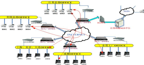 各地的IPPBX會自動識別輸入的號碼,并且通過網(wǎng)絡(luò)把號碼送到蘇州總部的1200交換機,江蘇的1200交換機已經(jīng)通過E1與江蘇網(wǎng)通的NGN服務(wù)器對接。網(wǎng)通收到你輸入的被叫號碼,即發(fā)出呼叫,完成你的一次呼叫。如果有新辦事處成立,只要有網(wǎng)絡(luò),可不用申請當(dāng)?shù)氐碾娫捑路也可實現(xiàn)輕松辦公。