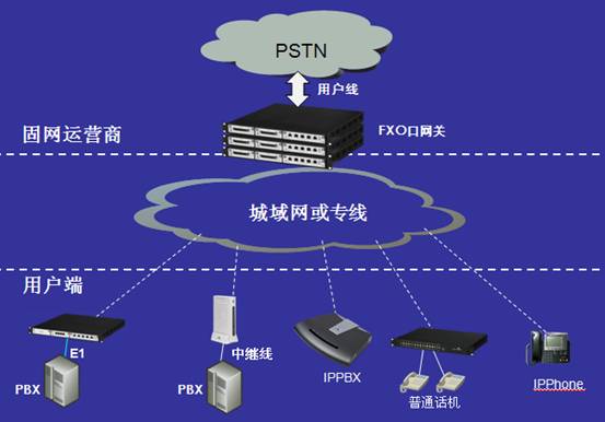 “固網(wǎng)IP化”方案無(wú)需軟交換,延用現(xiàn)有的數(shù)字程控交換機(jī)與業(yè)務(wù)支持系統(tǒng)作為核心網(wǎng)業(yè)務(wù)平臺(tái),只是在交換機(jī)外圍增加實(shí)現(xiàn)模擬/數(shù)字語(yǔ)音信號(hào)轉(zhuǎn)換成IP的VoIP網(wǎng)關(guān),并通過(guò)IP網(wǎng)絡(luò)實(shí)現(xiàn)與遠(yuǎn)程客戶(hù)終端設(shè)備的連接。遠(yuǎn)程的用戶(hù)端設(shè)備可以是傳統(tǒng)設(shè)備,如普通電話、傳真機(jī)或小型交換機(jī),也可以是基于IP的語(yǔ)音設(shè)備,如SIP電話、IPPBX等(如下圖所示)?梢詫(shí)現(xiàn)小區(qū)放號(hào)、企業(yè)直線電話、企業(yè)語(yǔ)音交換機(jī)接入等業(yè)務(wù)。