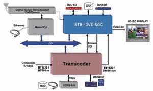轉(zhuǎn)碼硬件必須與整個(gè)STB系統(tǒng)中的其他系統(tǒng)進(jìn)行良好交互,其中包括數(shù)字調(diào)諧器、解多路復(fù)用器 (Demuxer)和解調(diào)器、DDR2存儲(chǔ)器、PCI總線,以及向STB SoC傳輸音/視頻的高帶寬接口。圖2是常見(jiàn)的架構(gòu)示意圖。