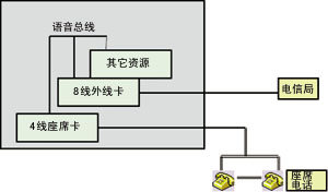 在傳統(tǒng)的語音卡設(shè)計(jì)中,一些語音卡廠商采用一體化設(shè)計(jì),根據(jù)功能的要求,采用通用的分離元件和集成電路自行設(shè)計(jì)電路。采用該類設(shè)計(jì)的語音卡板卡的通道類型、功能、通道數(shù)量在設(shè)計(jì)之初已決定,因而靈活性較差,在構(gòu)成CTI系統(tǒng)時會造成通道資源的浪費(fèi)。圖1展示了用此類板卡如何構(gòu)筑一個8外線+3座席的CTI系統(tǒng),當(dāng)用戶需要增加一個外線通道時,就需另增加一塊外線卡,投資較大。