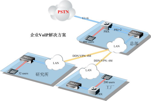 而目前網(wǎng)絡(luò)環(huán)境的改善,ADSL、寬帶的接入方式越來越普及,許多企業(yè)以及他們的分支機構(gòu)已經(jīng)通過各種方式接入Internet,鑒于Internet便宜的使用費用,廣泛的普及范圍,基于VPN/DDN的VOIP解決方案,徹底解決了上述問題,彌補了傳統(tǒng)電話網(wǎng)關(guān)的不足,且用戶可以根據(jù)自己需要,不斷擴展IP語音端口,"邊發(fā)展邊升級",經(jīng)濟靈活,是一套性價比非常高的方案。