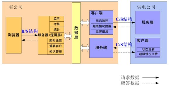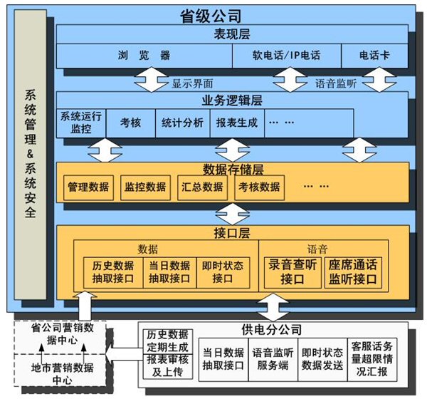 客服監(jiān)管系統(tǒng)中省級公司部分通過接口層與供電公司的客戶服務(wù)系統(tǒng)交換數(shù)據(jù)。通過業(yè)務(wù)邏輯層對接收到的數(shù)據(jù)進行處理、展現(xiàn),并且處理要發(fā)送的數(shù)據(jù),在此實現(xiàn)所有的業(yè)務(wù)邏輯。供電公司部分負責提供歷史的和當天的各種業(yè)務(wù)數(shù)據(jù)。整個結(jié)構(gòu)中也考慮到了數(shù)據(jù)中心,數(shù)據(jù)中心建立后將定期導(dǎo)入各供電公司客戶服務(wù)系統(tǒng)的歷史數(shù)據(jù),并提供給省級公司包括監(jiān)管系統(tǒng)在內(nèi)的各種應(yīng)用系統(tǒng)使用。