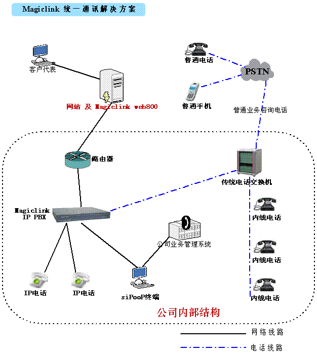 Magiclink統(tǒng)一通訊解決方案利用我公司的全線(xiàn)產(chǎn)品,將企業(yè)的:網(wǎng)站、內(nèi)部電話(huà)、呼叫中心、客戶(hù)管理系統(tǒng)完整的整合在一起。通過(guò)這種整合起到了:降低成本、增加營(yíng)銷(xiāo)手段、提升資源利用率的特點(diǎn)。