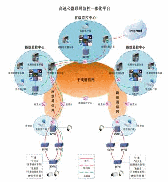 采用H.264編碼標(biāo)準(zhǔn)的EV702外場綜合接入設(shè)備,將原來外場分散的攝像頭、快球、云臺、可變情報(bào)板、報(bào)警感應(yīng)器等設(shè)備融為一體,同時(shí)也支持MPEG編碼標(biāo)準(zhǔn)的視音頻接入。EV702配備光纖通信板卡,不需要光端機(jī),可以直接連接光纖,進(jìn)行遠(yuǎn)距離。通過EV702連接成環(huán),并且具有自愈功能。可進(jìn)行集中式(路級監(jiān)控中心)、分布式(各級監(jiān)控中心)存儲。路級中心、區(qū)域中心、省級中心分布式多級監(jiān)控,由省中心統(tǒng)一設(shè)定權(quán)限,進(jìn)行集中管理。