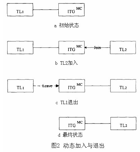 首先,點(diǎn)到點(diǎn)的會(huì)議首先是建立在ITG與TL1間的。TL2之后再加入會(huì)議中無論是通過邀請(qǐng)還是它自己通過ITG中MC的申請(qǐng)。ITG與TL2間新的連接在TL2加入時(shí)建立。最后,TL1在TL2加入后退出會(huì)議。這樣ITG與TL1間連接的中斷將不會(huì)影響ITG與TL2的連接。這也說明了移動(dòng)網(wǎng)絡(luò)電話的移交處理與ad hoc多點(diǎn)會(huì)議的動(dòng)態(tài)加入與退出是等價(jià)的。圖3(a)說明了ITG與TL1通信時(shí)的漫游。圖2(b)說明了子網(wǎng)1向子網(wǎng)2的移交處理。圖2(c)說明了在移交處理結(jié)束后ITG與TL1連接的中斷。最后,移交處理成功完成,只剩下ITG與TL2的連接,如圖2(d)所示。