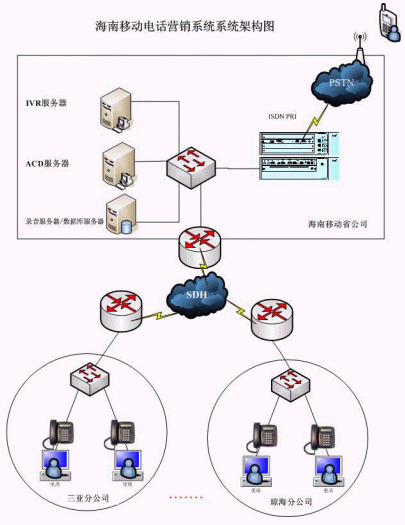 此次為電話營(yíng)銷(xiāo)系統(tǒng)一期工程,在省公司部署一套NBX V5000系統(tǒng)及相應(yīng)的CTI服務(wù)器,通過(guò)2條E1接入PSTN,在18個(gè)地市直接部署50個(gè)IP電話終端及坐席端軟件,語(yǔ)音走移動(dòng)已有的MDCN網(wǎng)絡(luò),一個(gè)集中受理分布處理的呼叫中心系統(tǒng)就建設(shè)起來(lái)啦,本次工程從設(shè)備到貨、系統(tǒng)上線試運(yùn)行,僅僅用了1個(gè)星期,我們海南移動(dòng)公司的項(xiàng)目經(jīng)理都驚訝的說(shuō)"太快啦啦,要是使用傳統(tǒng)的排隊(duì)機(jī)部署一個(gè)分布全省的類(lèi)似系統(tǒng),少說(shuō)工期也得幾個(gè)月"。經(jīng)過(guò)1個(gè)月的試運(yùn)行,系統(tǒng)運(yùn)行穩(wěn)定,各項(xiàng)系統(tǒng)指標(biāo)滿足合同要求,在11月份系統(tǒng)順利通過(guò)初驗(yàn)。