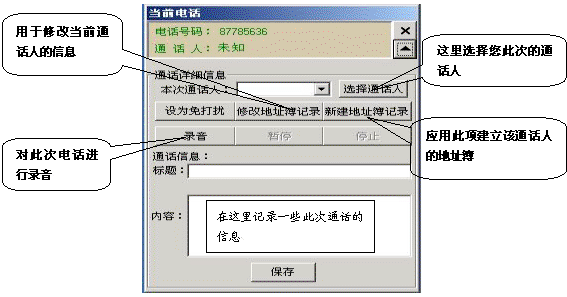 如果有電話打入時(shí),在屏幕的右側(cè)會(huì)彈出一個(gè)對(duì)話框,它顯示了當(dāng)前來(lái)電的號(hào)碼和通話人(如果在地址簿中沒(méi)有記錄則顯示為未知),點(diǎn)擊彈出全部菜單功能,它相當(dāng)于一個(gè)功能強(qiáng)大的通話記事本,用它既可以邊接聽(tīng)電話邊整理相關(guān)通話的文字記錄,又可以錄下通話的全部?jī)?nèi)容。如果這個(gè)電話是您不愿接聽(tīng)的,也可以將它設(shè)置為“免打擾”,這樣,這個(gè)號(hào)碼以后將存入免打擾名單中,若此號(hào)碼再呼入,系統(tǒng)將自動(dòng)掛斷此呼叫。如果這個(gè)電話是您認(rèn)為的重要客戶打過(guò)來(lái)的,您也可以將此號(hào)碼添加到重要客戶組中,以便您今后接聽(tīng)或設(shè)置電話轉(zhuǎn)移時(shí)能與其它呼入電話相區(qū)分。