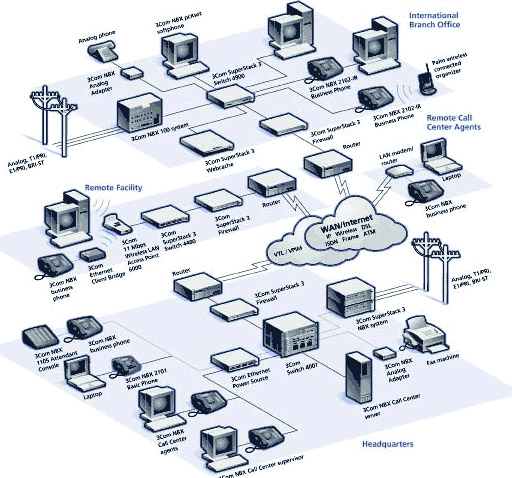 由于業(yè)務發(fā)展需要,公司屏棄了原有傳統(tǒng)PBX電話系統(tǒng),采用語音與數(shù)據(jù)融合技術的華為3com 網(wǎng)絡電話系統(tǒng)NBX,從而使企業(yè)間的通訊模式發(fā)生了革命性的改變。