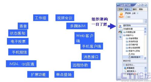 UcSTAR :Unified Communication Star,是深圳市擎旗信息技術(shù)有限公司推出的企業(yè)級融合通信平臺。是融合多種通訊手段(IM、文件、視頻、語音、EMAIL、SMS、電話、VOIP、MSN/QQ互通),融合企業(yè)的多種應(yīng)用系統(tǒng)緊密集成(OA、CMS、ERP、EIP、Portal、網(wǎng)站、應(yīng)用軟件),交流對象和交流內(nèi)容可管理,可控制,可擴(kuò)展,輕松實(shí)現(xiàn)部署企業(yè)的統(tǒng)一工作平臺。 UcSTAR能統(tǒng)一消息、統(tǒng)一溝通、統(tǒng)一管理、隨意選擇多種溝通手段,深航一直在找這樣的一種產(chǎn)品,公司信息部門從上到下給予極高的重視,商務(wù)的過程也都開了綠燈,一路順暢。