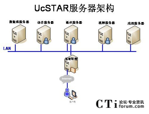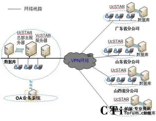 在公司總部部署主UcSTAR服務(wù)器,全國(guó)省級(jí)分公司分別部署一套子UcSTAR服務(wù)器,組成星型結(jié)構(gòu)公司內(nèi)部的溝通與協(xié)作系統(tǒng)。