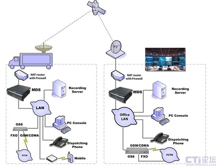 Zed-3的車載調(diào)度系統(tǒng)支持多種接口,通過無線網(wǎng)關(guān)提供的GSM、CDMA或模擬中繼端口,可以實現(xiàn)與固定電話、手機等外部電話的互通。即使在現(xiàn)場沒有任何可用的外線資源,例如沒有模擬電話接口,手機卡沒有信號,也仍然可以通過衛(wèi)星鏈路將呼叫連接到指揮中心的網(wǎng)關(guān)設(shè)備再落地,最大可能的保證現(xiàn)場調(diào)度系統(tǒng)與外部電話的通信。