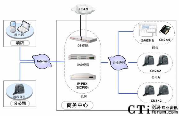 中天凱旋利用企業(yè)內(nèi)部完善的IP通信網(wǎng)絡(luò),在機(jī)房部署SICP系統(tǒng),負(fù)責(zé)整個(gè)語(yǔ)音通信系統(tǒng)的服務(wù)管理、用戶(hù)管理。部署GA90網(wǎng)關(guān)和GS8網(wǎng)關(guān),分別使用E1中繼線路和普通模擬線路接入PSTN網(wǎng)絡(luò),保證系統(tǒng)的通信。
